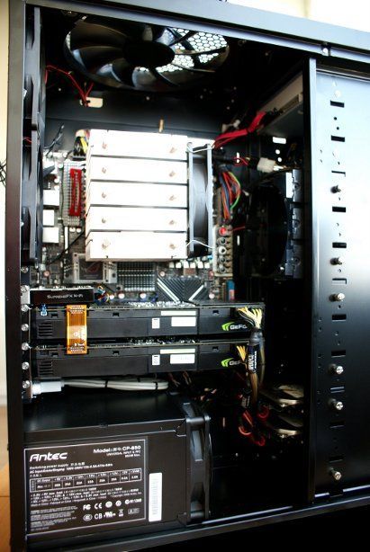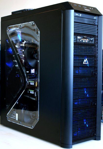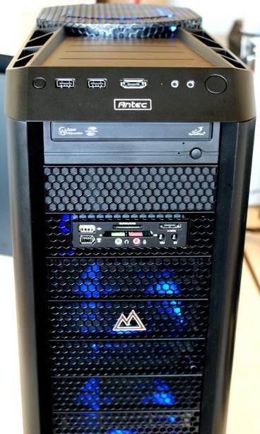 La caja ofrece 12 alojamientos para unidades (4 vienen ocupados), un marco frontal perforado con filtros de aire lavables, tres ventiladores frontales de 120 mm., dos posteriores de 120 mm. y uno superior de 200 mm. En el frontal del ordenador encontraremos una regrabadora de DVD, lector de tarjetas de memoria y un completo surtido de puertos que resultan de gran utilidad a la hora de conectar todo tipo de dispositivos, evitando la necesidad de acceder a la parte posteror del equipo.