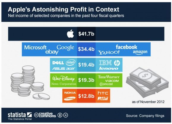 Para poner todo esto en perspectiva, una mini-infografía nos dice que el beneficio de Apple en su año fiscal 2012 ha superado al de Microsoft, eBay, Google, Yahoo!, Facebook y Amazon combinado. Casi nada.