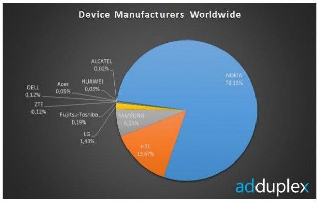 Si Samsung es líder indiscutible de Android vendiendo 8 de cada 10 dispositivos, Nokia no se queda atrás en Windows Phone y ocupa el mismo porcentaje según los datos de AdDuplex.