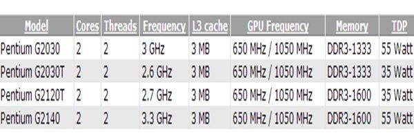 En cuanto a Intel, entre su catálogo 2013, nos llega listado e información de los nuevos Pentium G2030, G2030T, G2120T y G2140, todos con dos núcleos de procesamiento nativo, frecuencias de hasta 3,3 GHz, 3 Mbytes de caché, consumo de 35 o 55 vatios y GPU integrada con velocidad variable de hasta 1050 MHz.