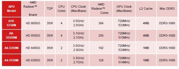 Aunque la serie acogerá un gran número de modelos para escritorio y portátiles, han sido estos últimos los primeros presentados. Se trata de los modelos de doble y cuádruple núcleo ‘Piledriver’ A10-5750M, A8-55550M, A6-5350M y A4-5150M, todos con un TDP de 35 vatios, soporte a memorias DDR3-1866 y DDR3-1600 y gráfica integrada funcionando a una frecuencia variable de hasta 720 MHz.