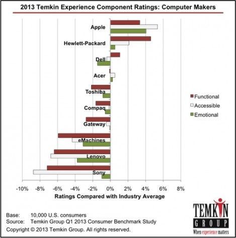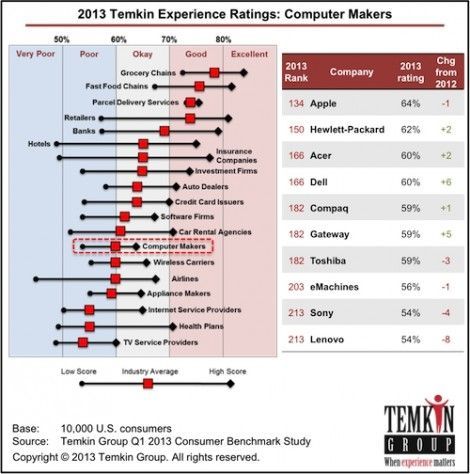 Un estudio realizado por el Grupo Tempkin entre 10.000 usuarios estadounidenses de computadoras, ha vuelto a situar a Apple en el primer puesto en satisfacción del usuario, con HP en segunda posición.