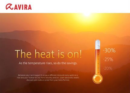Avira se suma a la ola de verano. En esta ocasión, ha lanzado una nueva promoción dedicada al canal de distribución con la que podrán vender las soluciones del fabricante con un descuento medio del 20%. Así, Avira tomará la temperatura de Tettnang, en Alemania durante julio y agosto para lanzar el descuento equivalente.