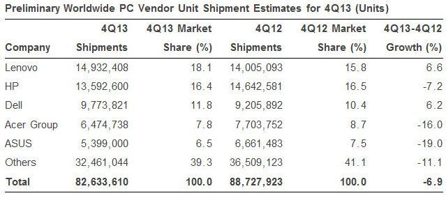 Por fabricantes, Lenovo, HP y Dell encabezaron las ventas trimestrales. Lenovo es la única de las grandes compañías que aumentó ventas en el total de 2013 lo que le permite empatar virtualmente con HP a la cabeza del mercado con cuotas del 16,9 y 16,2 por ciento respectivamente.