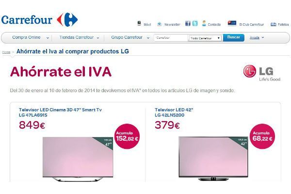 Al igual que pasa en los días sin IVA de El Corte Inglés o Media Markt, en este caso el descuento real no es del 21% del IVA sino del impuesto aplicado al producto. De esta forma, por cada 100 euros gastados en Carrefour se descuentan 17,35 euros, esto es, alrededor de un 18%.