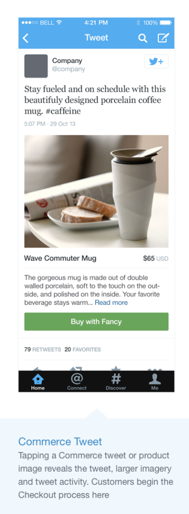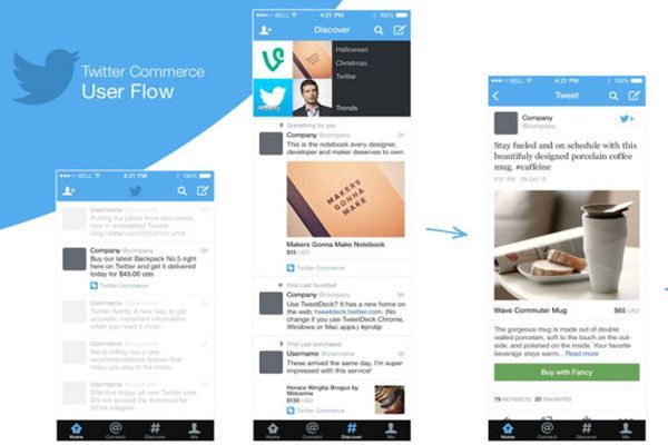 Las imágenes de Twitter Commerce han aparecido en el sitio de comercio electrónico Fancy.com. Fuentes cercanas al proyecto indican que se trataría de una maqueta con el diseño de esta plataforma comercial de Twitter que se apoyaría en sitios como Fancy y otras compañías similares con las que estaría en conversaciones.