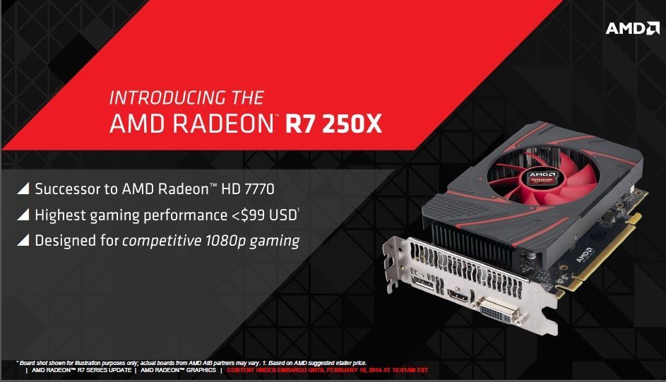 AMD sigue reforzando su nueva gama de tarjetas gráficas dedicadas Radeon R9 y R7 con el lanzamiento de la Radeon R7 250X, un modelo de gama baja-media con precio de referencia de 99 dólares.