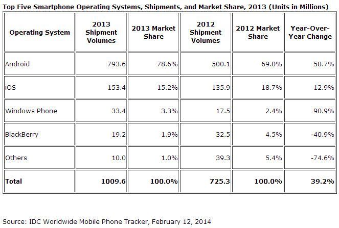 El informe de IDC confirma el batacazo de Blackberry con 19 millones de smartphones vendidos para una cuota de mercado del 1,9 por ciento y en una tendencia en franco descenso.
