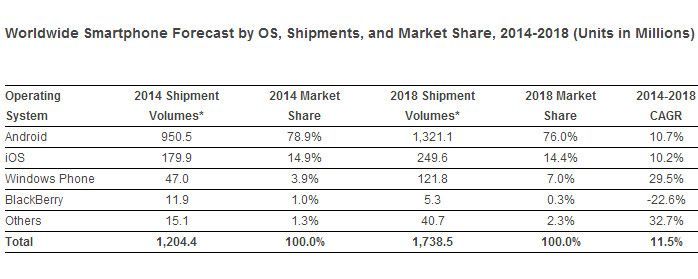 En cuanto a plataformas no habrá demasiados cambios. Android seguirá arrasando aún bajando ligeramente en cuota de mercado. El iOS de Apple se mantiene y la que más crecerá será Windows Phone aunque se limitará al 7 por ciento de cuota en 2018. BlackBerry reducirá ventas a la mitad quedando como una plataforma residual y según los datos de IDC los alternativos como Tizen, Ubuntu o Firefox OS no lograrán ua cuota relevante.