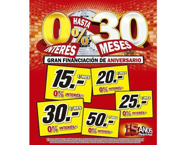 La promoción Gran Financiación de Aniversario al 0% de Media Markt permite a los clientes financiar sus compras desde un mínimo de 10 meses hasta un máximo de 30 meses sin intereses ni gastos de apertura. La financiación al 0% está disponible para compras de producto iguales o superiores a 150 euros.