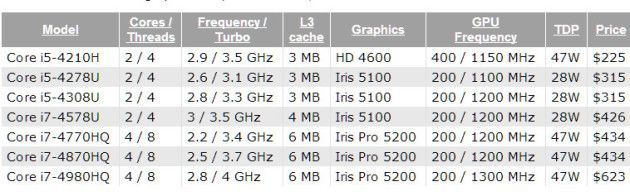 Especialmente destinados a Ultrabooks, Intel oferta los nuevos Core i5-4278U, i5-4308U y i7-4578U, modelos de ultrabajo voltaje con un consumo TDP establecido en 28 vatios. Las mejoras llegan del aumento de frecuencias de trabajo de sus dos núcleos y cuatro hilos alcanzando los 3,5 GHz. También de la gráfica integrada, una Intel Iris 5100 de potencia suficiente para estos ultraligeros.