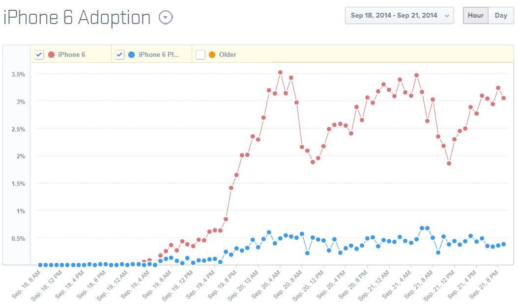 Aunque no hay datos de venta oficiales salvo el récord de reservas en las primeras 24 horas, Mixpanel asegura que la tasa de adopción del iPhone 6 de menor tamaño está siendo muy superior al del modelo «plus».