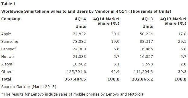 Apple habría superado a Samsung en venta mundial de smartphones durante el último trimestre de 2014, según los datos facilitados por Gartner.