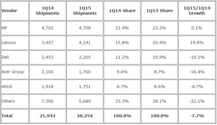 Datos negativos aunque esperados, después de las informaciones de caída de venta de portátiles y en general de un mercado PC titubeante que ha roto la pequeña tendencia de consolidación observada a finales de 2014.