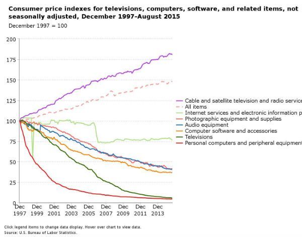 Desde el departamento de trabajo de Estados Unidos nos llega una interesante gráfica que nos muestra el cambio en los precios tecnológicos. Analizado desde diciembre de 1997 hasta agosto de 2015, podemos ver cómo cada nicho se ha comportado de forma diferente. Una evolución dada en el país americano que nos puede servir de referencia global.