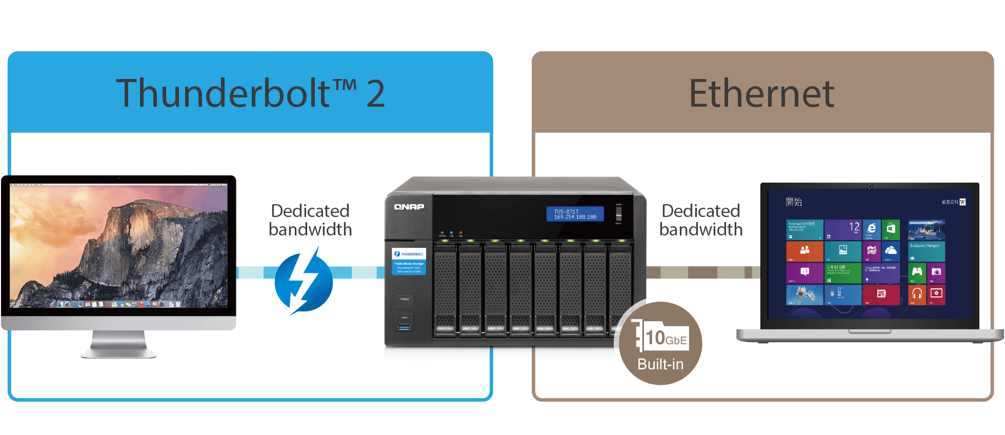 Además de estoel TVS-871T de 8 bahías no sólo cuenta con la tecnología Thunderbolt 2, sino que también tiene puertos duales 10 GbE que le dan una gran flexibilidad, pudiendo ejecutar simultáneamente servicios generales Ethernet además de la red Thunderbolt 2, de forma totalmente independiente y sin interferencia de ancho de banda.