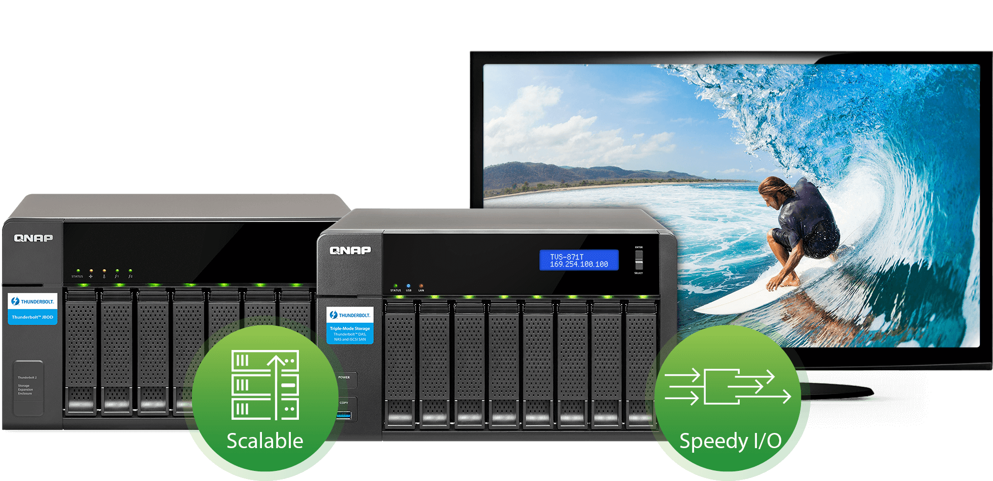 «La mayoría de los usuarios de Thunderbolt DAS se sienten frustrados ante la imposibilidad de compartir muchos archivos de forma rápida para aumentar la productividad del equipo. El Turbo vNAS Thunderbolt 2 TVS-871T integra perfectamente el almacenamiento de alta velocidad del Thunderbolt DAS y el intercambio flexible de archivos en redes de 10 GbE, resolviendo así por completo los obstáculos que afrontan los usuarios convencionales de Thunderbolt DAS «.