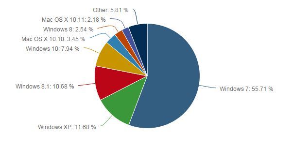 Windows XP es el segundo sistema del escritorio con una cuota del 11,68%. Incomprensible para un sistema sin soporte pero ahí está. Windows 8.1 mantiene el 10,68 por ciento mientras que Windows 8 todavía tiene un 2,54 por ciento y Vista casi ha desaparecido con el 1,74. Linux se mantiene como siempre en cuotas cercanas al 2 por ciento.