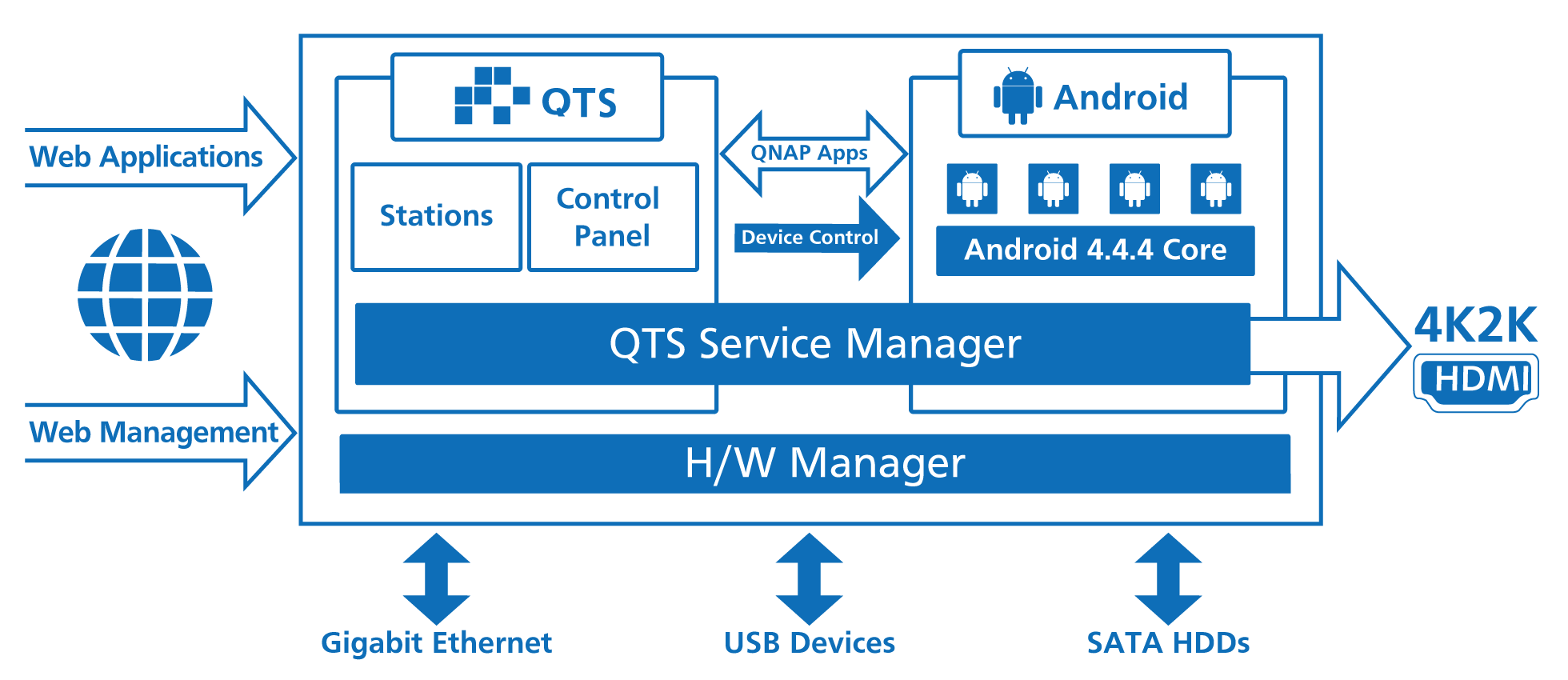 Ambos sistemas comparten la misma base de datos de almacenamiento, lo que permite acceder simultáneamente a archivos multimedia y documentos desde QTS y Android.