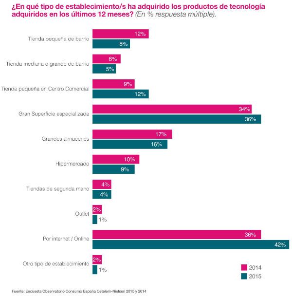 El 61% de los españoles adquirió algún tipo de este producto en 2015, dos puntos por debajo respecto al 2014. De estos el 42% lo hizo por Internet mientras que el 36% se decantó por grandes tiendas especializadas. Ambos terrenos crecen y se posicionan como el punto de venta preferido.
