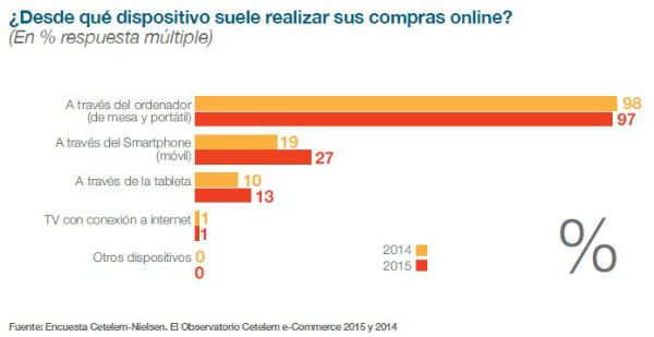 Al preguntar por el dispositivo de acceso al comercio electrónico, el 97% de los encuestados se refieren al ordenador, el 27% aluden al smartphones y el 13% se decantan por el tablet. Los televisores Smart solo se quedan con un 1% de las compras on-line. No hay espacio para más tipos de compras.