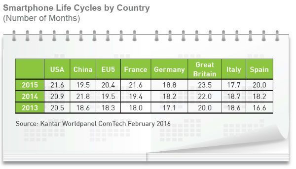 De media, los españoles utilizamos un móvil durante 20 meses, según apunta el panel de Kantar. Algo menos de dos años de vida que se ha ido alargando en el tiempo debido a la maduración del mercado. En otros países como Italia o China, la tendencia ha sido la contraria.