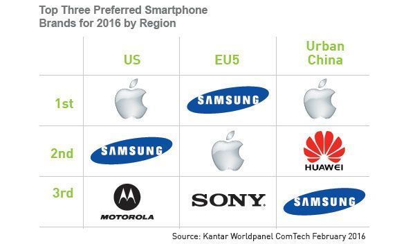 Apple será número uno en Estados Unidos y China mientras que Samsung seguirá líder en Europa. Huawei tomará la segunda posición en la China urbanita dejando al fabricante coreano líder en una terca posición.