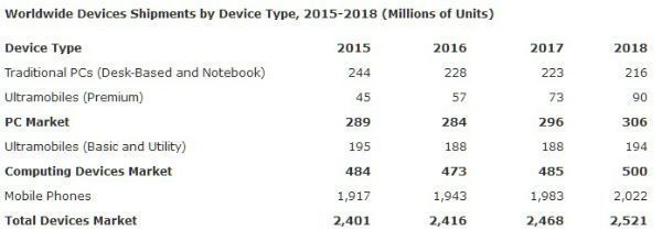 En términos general la consultora espera que en 2016 se vendan 2.400 millones de dispositivos, entre terminales móviles, portátiles y ordenadores tradicionales. Un número un 0,6% menor al de 2015 motivado por la caída cada vez más ligera en el mercado PC.