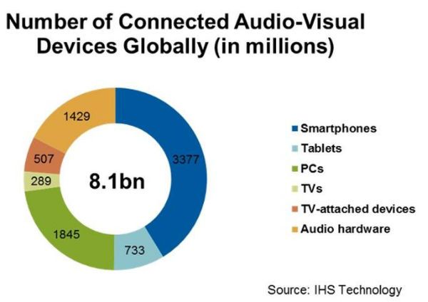 A nivel global y según las estadísticas de IHS Technology, hay una media de 4 dispositivos electrónicos por hogar siendo el smartphone el aparato predominante y Norteamérica la zona más saturada. Por detrás, los ordenadores y equipos de audio. Los televisores, curiosamente, están mucho más abajo.