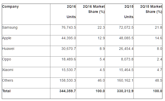 ¿Quién dijo crisis en el mercado smartphone? En el balance del segundo trimestre de Gartner seguimos en aumentos del 4,3% comparados con el mismo trimestre del 2015 que llegan hasta los 344 millones de smartphones enviados a nivel mundial. Es cierto que ya no estamos en crecimiento de doble dígito pero los cinco fabricantes líderes del sector siguen subiendo.