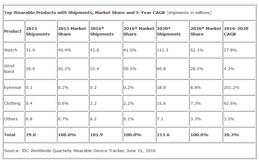 El segmento de los dispositivos conectados, wearables, experimentará un crecimiento interanual del 29 por ciento en 2016 y tasas del 20% hasta 2020, donde se venderán 214 millones de dispositivos anuales según las previsiones de IDC.
