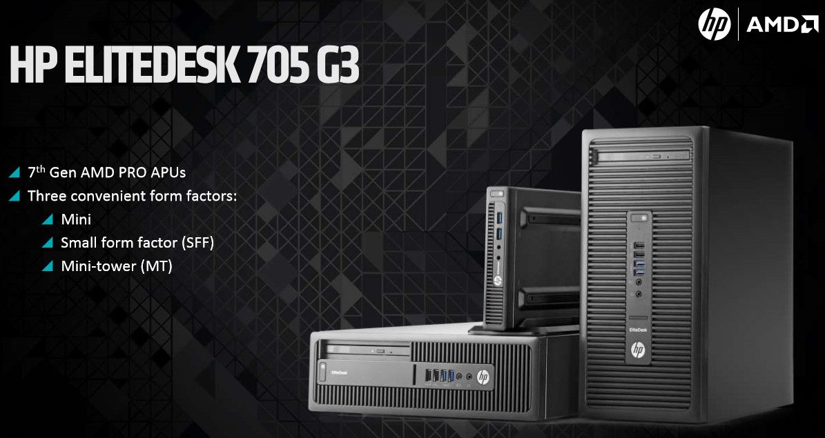 AMD ha anunciado los primeros modelos OEM con estas APUs PRO Bristol Ridge procedentes de Lenovo y HP, como el EliteDesk 705 G3 que se comercializará en distintos factores de forma.