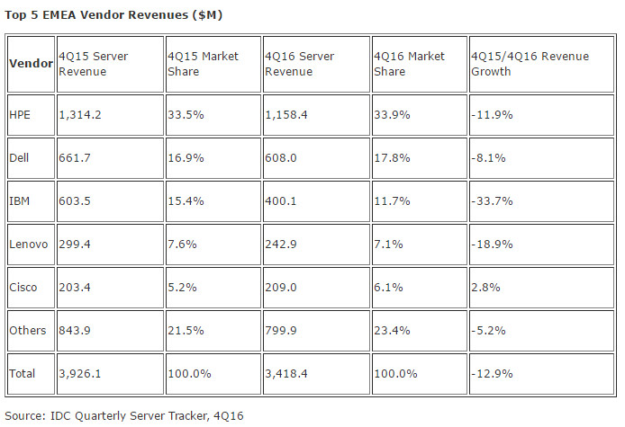 Cisco cierra el top-5 y es el único fabricante que logró crecer en el trimestre, si bien sus ingresos son una sexta parte de los del líder HPE. Más información| Servidores en Emea Q416 – IDC