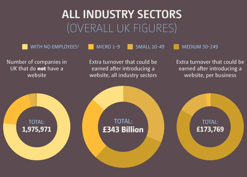Las 330.000 PYMES sin un sitio web, se estarían perdiendo una facturación adicional de 150 mil millones. Las empresas de mediano tamaño podrían aumentar su facturación en una media de 16,7 millones de libras anuales.