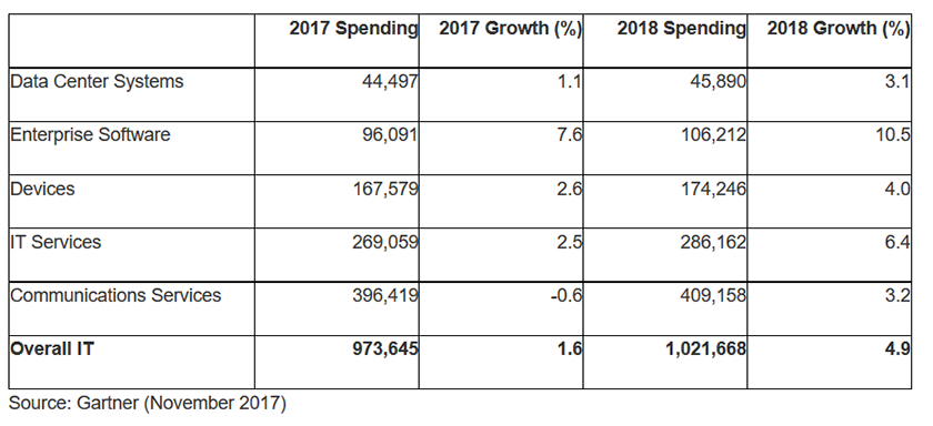 En términos generales, la inversión tecnológica en EMEA superará el billón (millones de millones) de dólares en 2018. El volumen de negocio será un 4,9% más del esperado para este 2017 cuando esta industria ingresará algo más de 973.000 millones de dólares. Un ritmo que vuelve a cifras positivos después de que en 2017 cayerá un 1,4%. La subida se dará en todas las divisiones.