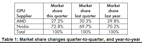 Echando un vistazo a la cuota de mercado vemos que NVIDIA ha mejorado su posición frente a AMD, pasando del 69,7% al 72,8% (segundo trimestre de 2017 frente al tercer trimestre de 2017), mientras que la segunda ha caído del 30,3% al 27,2%.