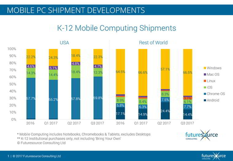 De acuerdo con la firma de análisis, los equipos Chrome OS de Google son la principal elección para alimentar en el sistema educativo lo que llaman PC móviles y que incluyen ordenadores portátiles, netbooks, tablets y ordenadores Chromebooks.