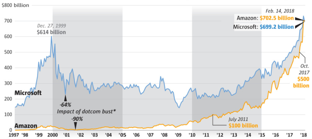 Han tenido que pasar 21 años para que una modesta librería haya superado a todo un gigante de la tecnología como Microsoft. Cuando nació Amazon, muy cerca de la sede central de la firma de Bill Gates, ésta valía 140.000 millones de dólares y junto a Intel, era la mayor firma mundial de tecnología al dominar el creciente segmento de ordenadores personales.