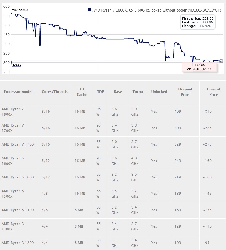 Dado que ambas versiones soportan overclock y que gracias a Ryzen Master éste se puede hacer en un clic no se justificaba la enorme diferencia de precio que había por ejemplo entre el Ryzen 7 1700 y el Ryzen 7 1800X, así que es comprensible que hayan bajado tanto en apenas unos meses.