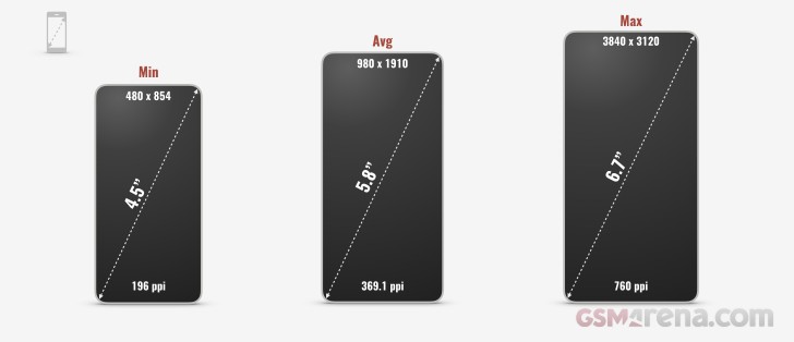 En la última gráfica podemos ver que el tamaño mínimo, medio y máximo de pantalla de los smartphones ha crecido, gracias sobre todo al empuje del formato todo pantalla (18:9 y 19:9).