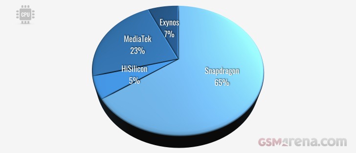 Por lo que respecta a los SoCs más utilizados Qualcomm se impone con un 65%. MediaTek queda en segunda posición con un 23% y cierran la clasificación los Exynos de Samsung con un 7% y los HiSilicon de Huawei con un 5%.