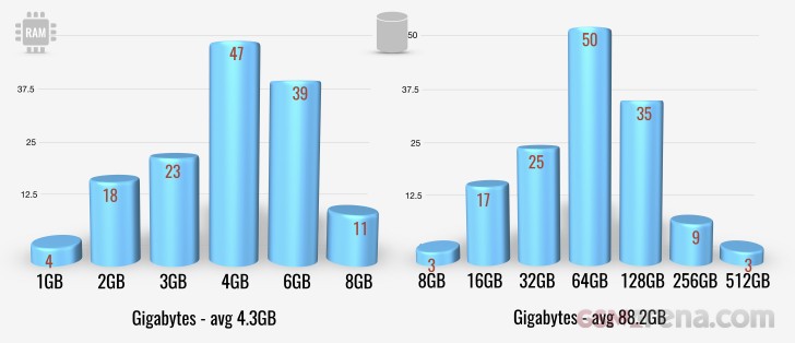 La mayoría de los smartphones disponibles (un 85%) tienen ranura para tarjetas microSD que permiten ampliar la capacidad de almacenamiento del terminal. Los modelos con 4 GB y 6 GB de RAM se han convertido en mayoría, y lo mismo ocurre con las versiones de 64 GB de capacidad de almacenamiento, dos claves que evidencian un aumento importante a nivel de prestaciones que se ha extendido a la gama media.