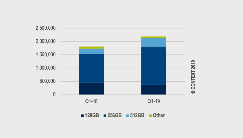 No hablamos sin motivos, los últimos datos que ha publicado CONTEXT confirman que la tasa de adopción de unidades SSD en portátiles sigue creciendo en Europa Occidental. El 63% de los portátiles que se vendieron durante el primer trimestre de 2019 utilizaban al menos un SSD, una cifra que representa un crecimiento importante frente al 50% registrado durante el primer trimestre de 2018.