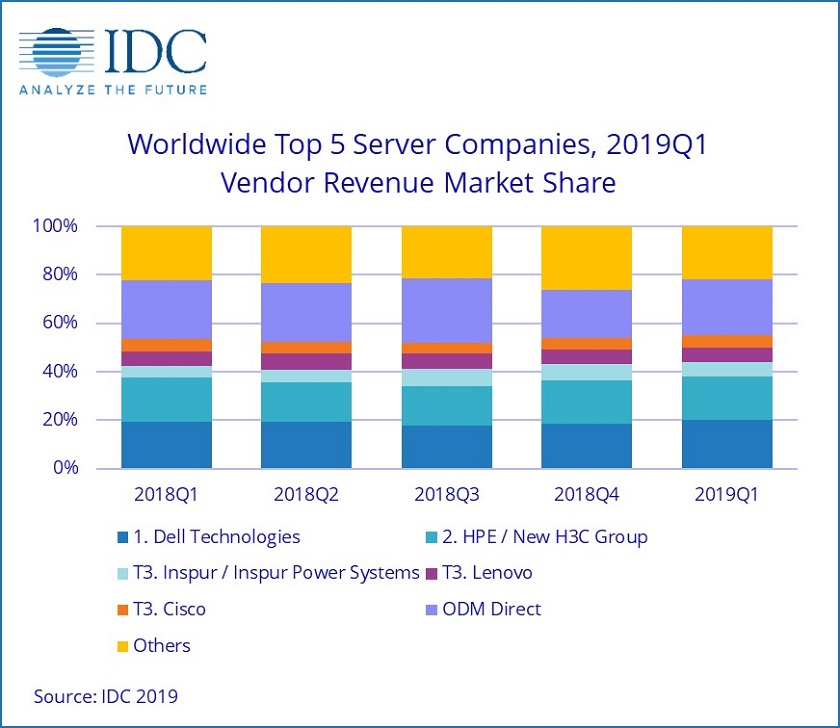 Por proveedores, Dell Technologies se ha situado en la primera posición en el ránking mundial de servidores con una cuota de mercado del 20,2%; después de haber incrementado sus ingresos un 8,9%.