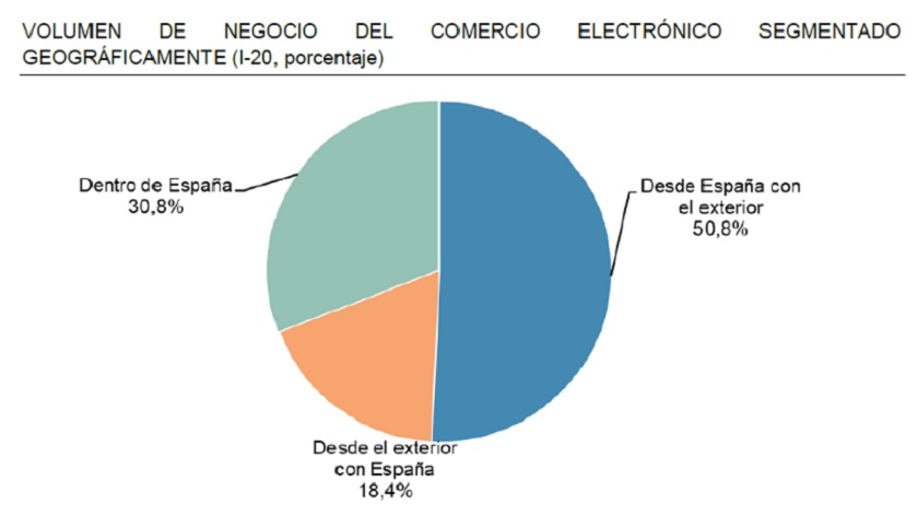 El 49,2% de los ingresos generados por el comercio electrónico durante este período se ha generado en páginas web de comercio electrónico en España, mientras que el 50,8% restante procede de compras con origen en nuestro país pero realizadas en páginas online de comercio electrónico fuera de nuestras fronteras.