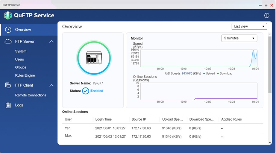 • Servidor FTP: la conexión SSL/TLS cifrada ofrece una mayor seguridad y protege nuestras transferencias FTP. El ancho de banda de QoS permite ajustar límites de transferencia FTP o límites de velocidad para usuarios y grupos. El motor de reglas de QuFTP permite una configuración más detallada, incluyendo las horas de acceso, limitando el acceso solo a la carpeta raíz del FTP, añadiendo marcas de agua a imágenes y vídeos, y mucho más.