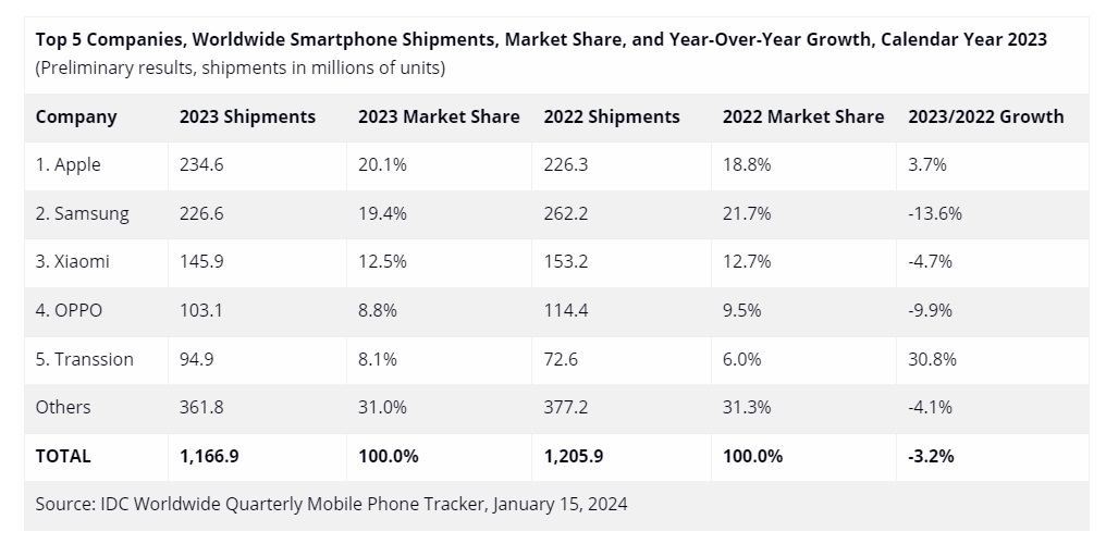 Apple vendió más de 234 millones de iPhone en 2023, un 3,7% más que en año anterior. Cifra suficiente para pasar a Samsung que se quedó con unas ventas de 226 millones y una caída del 13,6%. Bastante por detrás y en un tercer lugar, Xiaomi con 145 millones de terminales y también a la baja (4,7% en su tasa interanual) y OPPO cayendo un 9,9% con 103 millones de móviles. Transsion se queda en una quinta posición mundial y un crecimiento del 30%.
