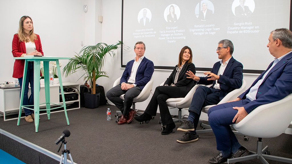 En la mesa participaron Alejandro Allende, Director de Desarrollo de Negocio de ZeroComa; Èlia Urgell, Tax & Invoicing Product Manager en Wolters Kluwer Tax & Accounting España; Alejandro Allende, Director de Desarrollo de Negocio de ZeroComa; Ronald Lozano, Engineering Legal Team Manager de Sage y Sergio Ruiz, Country Manager en España de B2Brouter.